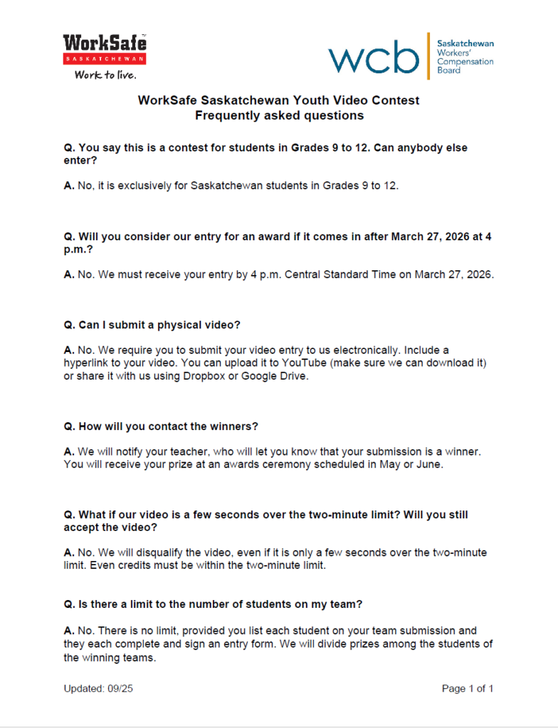 If you have any questions about the contest, email BAntoshkiw@wcbsask.com (subject line: Youth Video Contest).