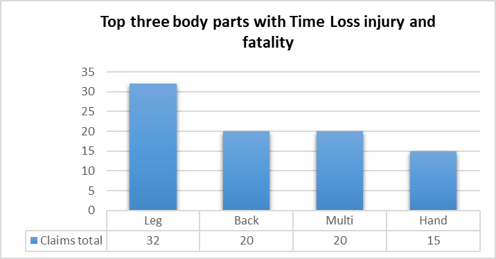 of these injuries are to leg. The most common of these injuries are due to struck by falling object such as bricks, blocks, structural stone, dirt, earth, metal materials – nonstructural, uns., floors, walkways, ground surfaces, tires, inner tubes, wheels. |