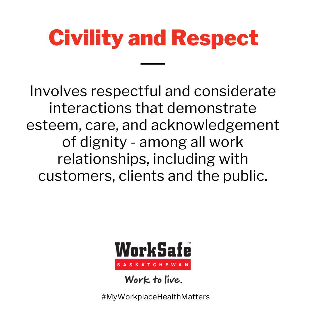 Civility and respect is present in a work environment where workers are respectful and considerate in their interactions with one another, as well as with customers, clients and the public. Civility and respect are based on demonstrating respect, care and consideration for others, and acknowledging their dignity.