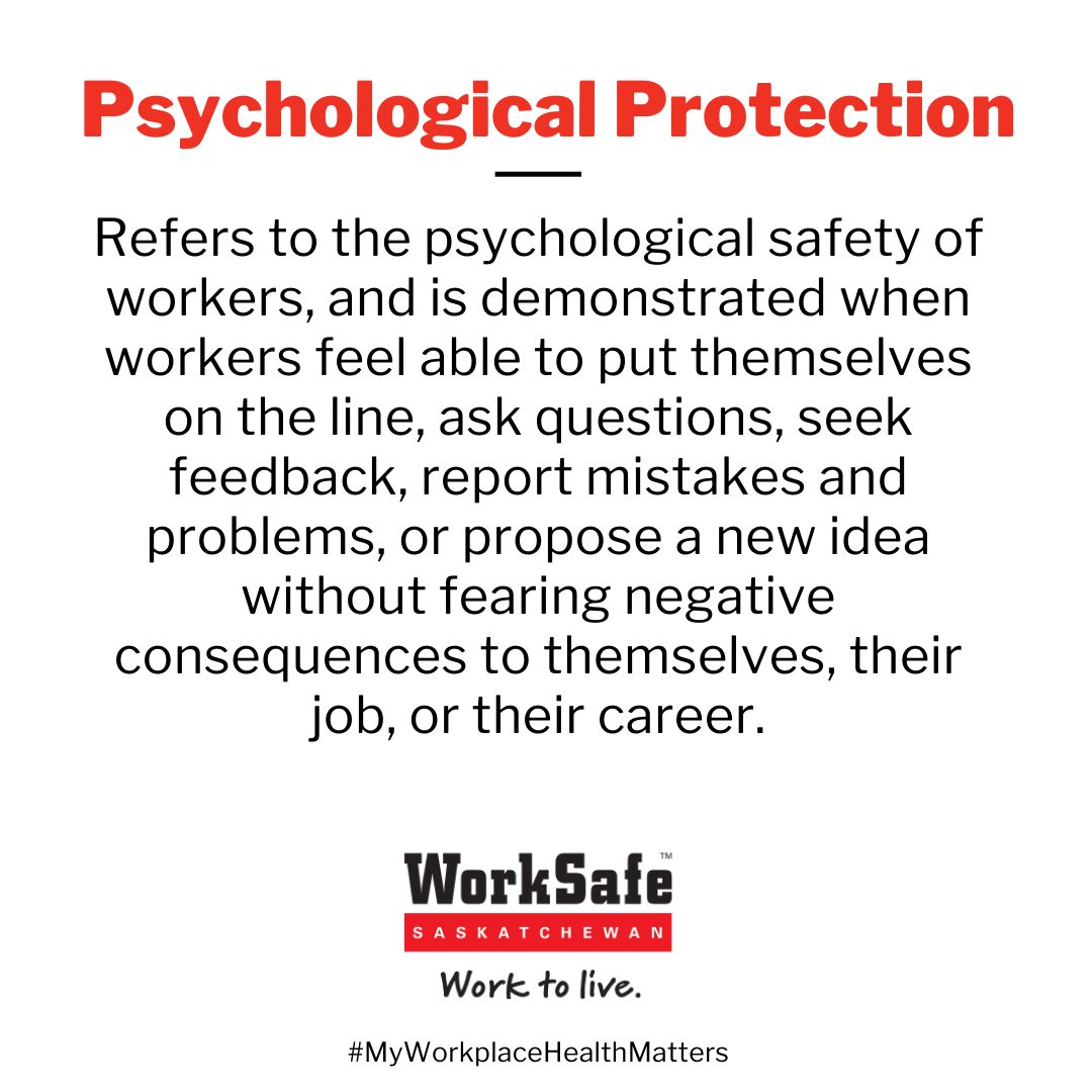 Psychological protection is present in a work environment where workers’ psychological safety is ensured. Workplace psychological safety is demonstrated when workers feel able to put themselves on the line, ask questions, seek feedback, report mistakes and problems or propose a new idea without fearing negative consequences to themselves, their job or their career. A psychologically safe and healthy organization actively promotes emotional well-being among workers while taking all reasonable steps to minimize threats to worker mental health.