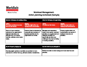 Workload management is present in a work environment where assigned tasks and responsibilities can be accomplished successfully within the time available. This is the risk factor that many working Canadians describe as being the biggest workplace stressor (e.g. having too much to do and not enough time to do it). It has been demonstrated that it is not just the amount of work that makes a difference, but also the extent to which workers have the resources (time, equipment, support) to do the work well.