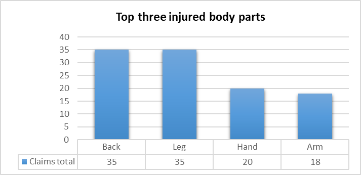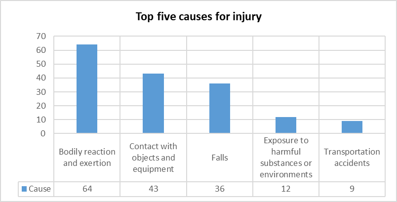 of these injuries are to back. The most common of these injuries are due to bending, climbing, crawling, reaching, twisting such as bodily motion or position of injured, ill worker. |