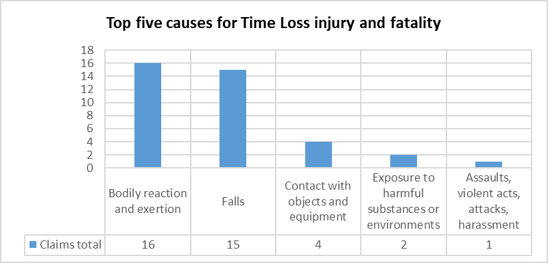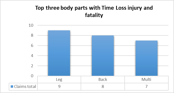 of these injuries are to leg. The most common of these injuries are due to slip, trip, twisting, stepped on or in, loss of balance – without fall such as bodily motion or position of injured, ill worker. |